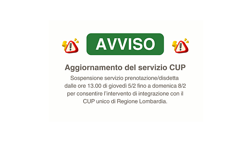 Per questa ragione il servizio di prenotazione/disdetta – sportello, call center, online – sarà sospeso dalle ore 13.00 di giovedì 5 febbraio fino a domenica 8 febbraio per consentire l’intervento di integrazione con il CUP unico di Regione Lombardia.
